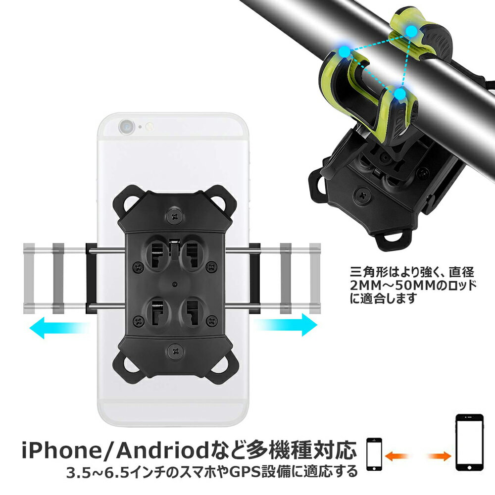 対応スマホサイズ:40-100mm、対応ハンドル径:2mm-50mm。