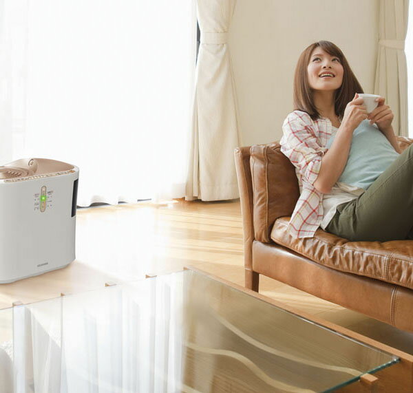 ヒーターで温められた水が超音波振動によって霧状(ミスト)になり室内を加湿する、強力ハイブリッド加湿器(加熱式+超音波式)。